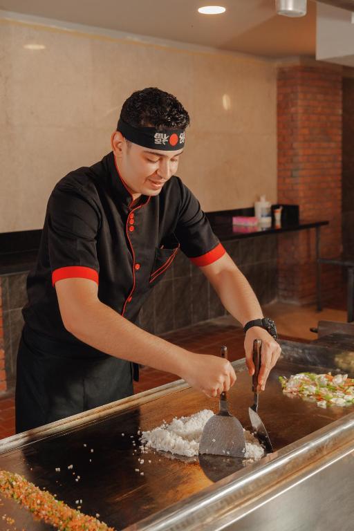 International buffet dishes are served at the resort’s main restaurant. A variety of drinks, including exotic cocktails, are available at the beach and pool bars.